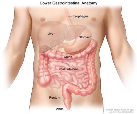 Colon simply means ‘Large intestine’. The rectum begins after the large intestine and ends at the anus.